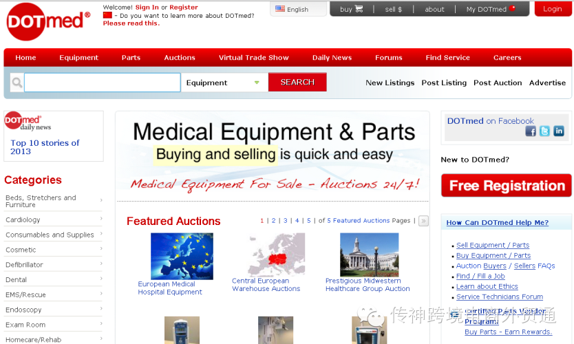 Dotmed平台创建于1999年04月23日,其运营中心位于美国,是全球领先的医疗设备,零件及服务的公共贸易平台。业界内2万多访客每天访问DOTmed平台来购买他们需要的东西,90%的人都是健康保健提供者和终端用户。