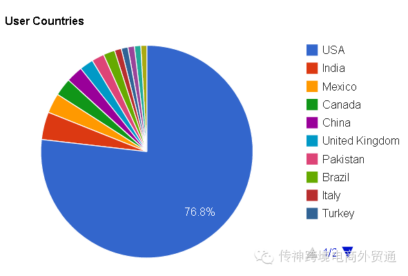 1. 60%的访客来自欧美,其次为亚洲等 访客国家分布如下: