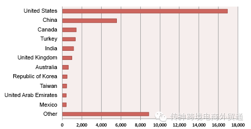 买家分布如下,由数据可知美国,中国,加拿大,土耳其,印度和其他的买家比较多。