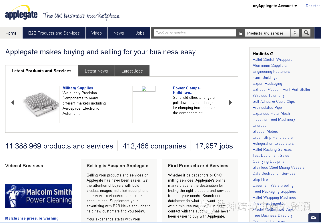 Applegate是英国最大的在线提供B2B公司产品和服务的平台。从1997年开始applegate是英国最大的,综合性的同时使用最广泛的B2B信息提供商,为英国和爱尔兰工业,制造业及技术公司。