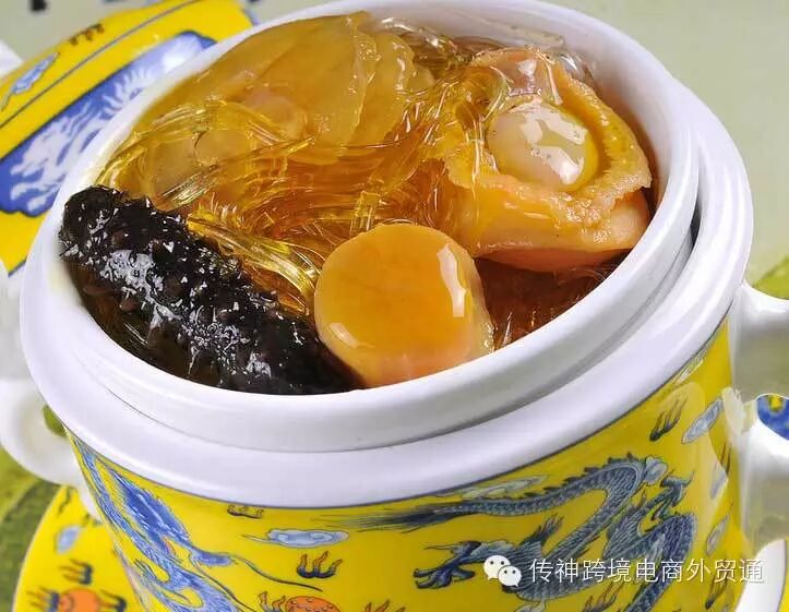 如:佛跳墙 Fotiaoqiang (Steamed Abalone with Shark's Fin and Fish Maw in Broth)